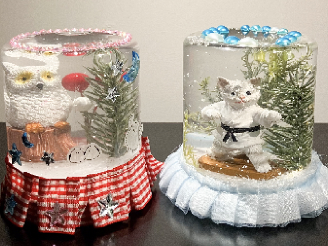 ケースの中に好きな飾りを入れて、水やラメを加えると…ゆらゆらキラキラ光る世界ができあがります。どんなスノードームになるかは作った人次第!世界にひとつだけのオリジナルスノードームを作ってみよう!