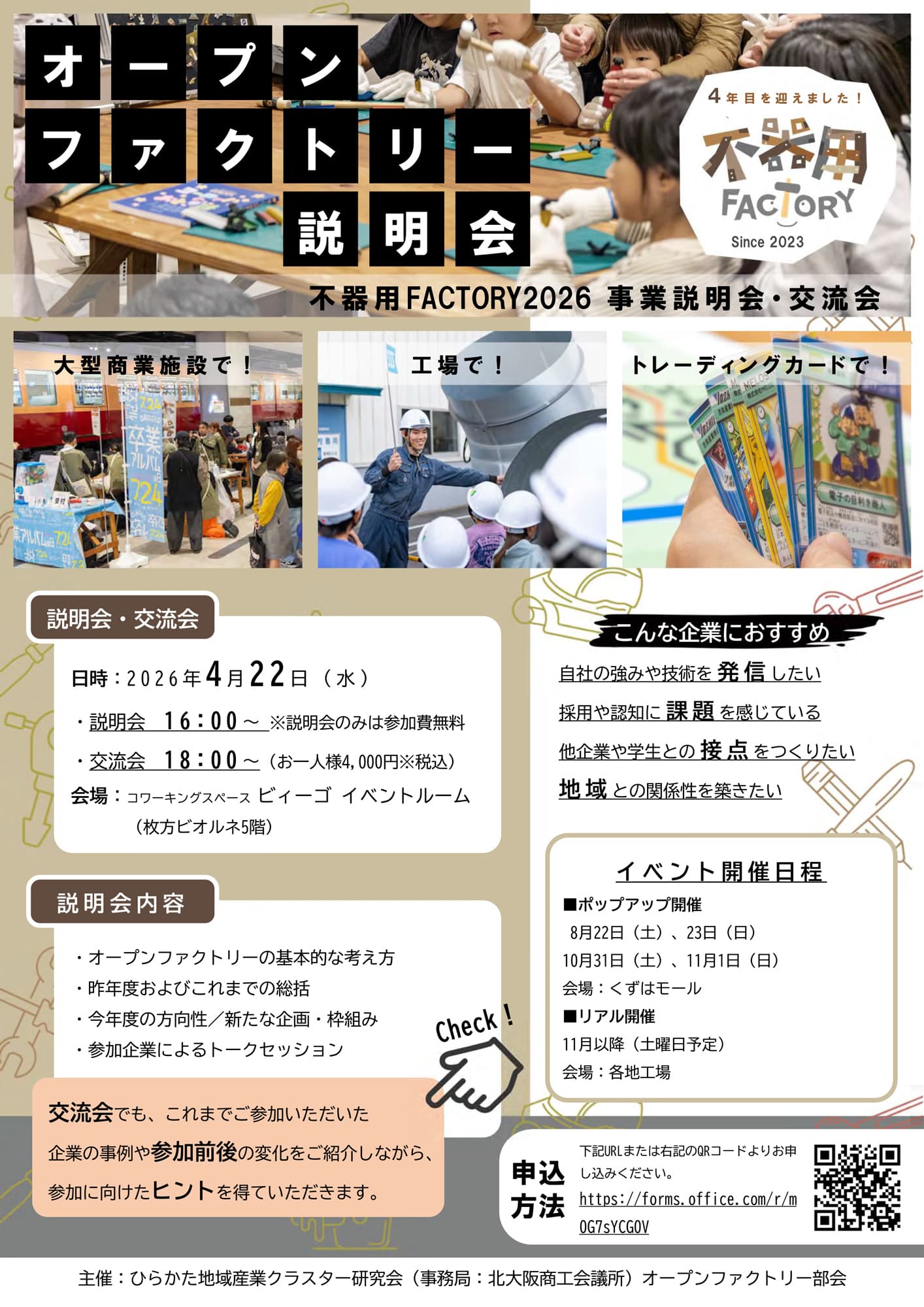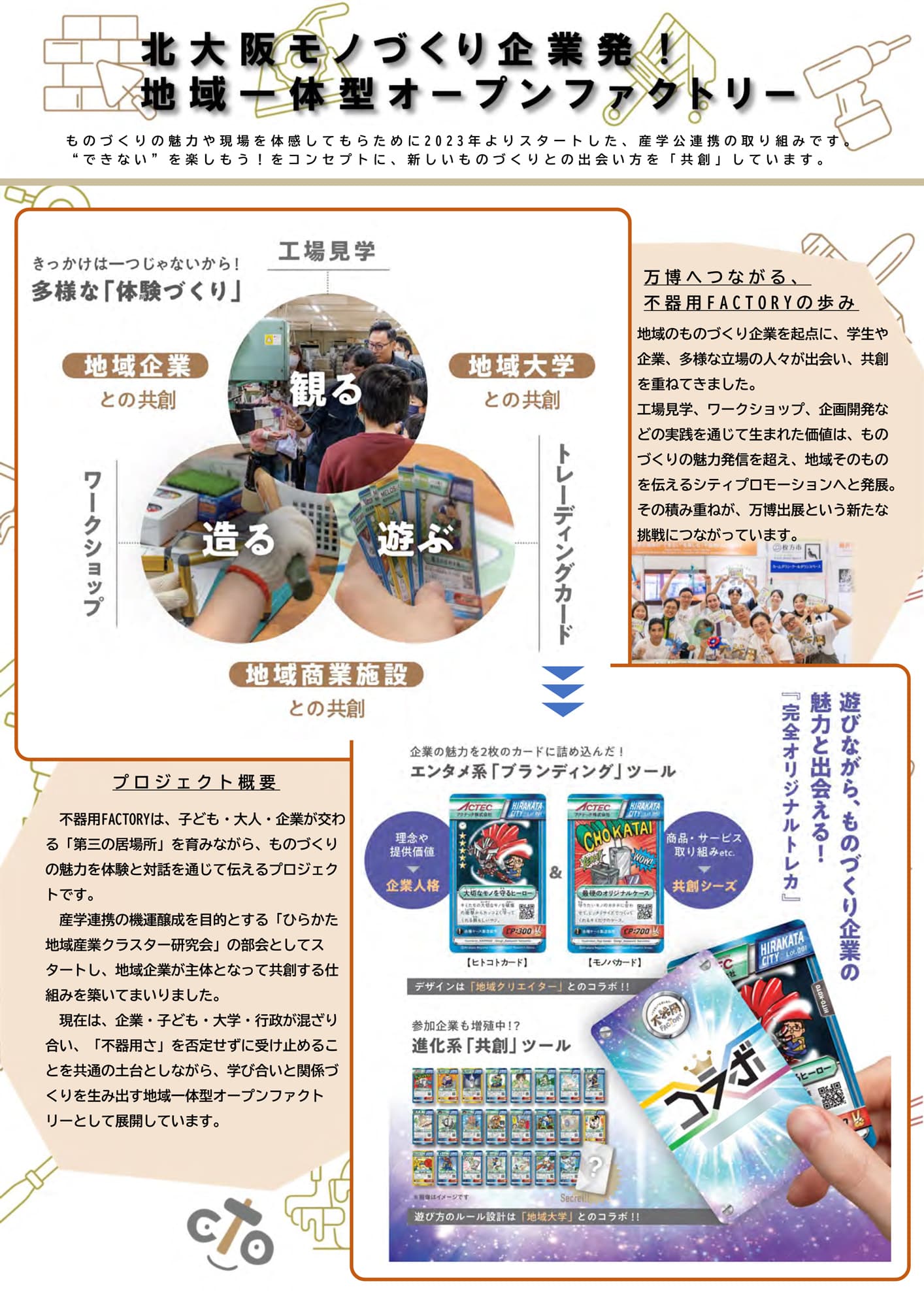 不器用FACTORYは、大阪府枚方市・交野市・寝屋川市エリアのものづくり企業が工場をひらき、来場者との交流を通じて魅力を発信する「オープンファクトリー型プロジェクト」です。